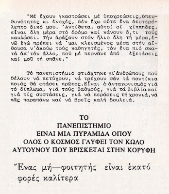 Παρότι και η ιδιωτική εκπαίδευση έχει τα χάλια της δεν βλέπω κανέναν να διαμαρτύρεται (update: δεν αναφέρομαι στους φοιτητές) για τα ιδιωτικά νηπιαγωγεία, δημοτικά, γυμνάσια και λύκεια, ή για το γεγονός πως πρέπει να περάσεις από φροντιστήρια ξένων γλωσσών για να μάθεις αγγλικά και μαθηματικών, αρχαίων κ.λπ. για να μάθεις μαθηματικά και αρχαία (γιατί χωρίς φροντιστήριο, στις Πανελλαδικές, γράφεις όχι κάτω από τη βάση, αλλά ούτε 5 δεν πιάνεις). Δηλαδή όλα αυτά θεωρούνται ως «καλώς έχει» και το πρόβλημά τους είναι μόνο να μην ιδιωτικοποιηθούν τα πανεπιστήμια...